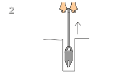 井戸掘削ツールは人力で回転させて掘り進めます。掘った土は先端のオーガーに溜まりますので、ある程度溜まったら土を取り除きます。深くなる度にロッドを継ぎ足して長くします。深くなると重くなってくるので、持ち手の部分にもロッドを継ぎ足して複数人で掘ることもできます。